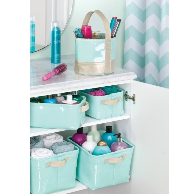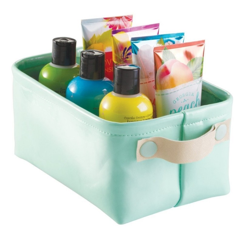 Корзина для хранения заколок и косметики не боится воды легко моется и имеет компактные размеры. А нежный мятный оттенок украсит вашу ванную. Корзина изготовлена из непромокаемого материала, легко моется мылом и губкой.