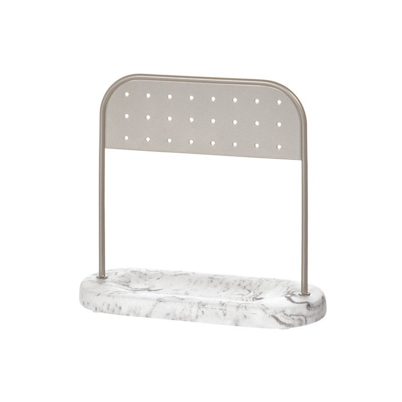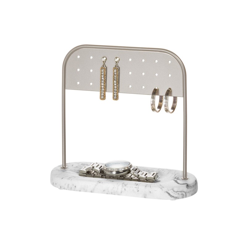 Создайте стильный туалетный столик с держателем для серег iDesign Dakota. Этот отдельно стоящий органайзер для ювелирных изделий имеет 24 перфорации для хранения и демонстрации до 12 пар сережек, а в нижней части предусмотрен универсальный лоток для хранения небольших аксессуаров, таких как кольца, браслеты, ожерелья, часы и многое другое. Благодаря тонкому профилю и компактной конструкции он отлично подходит для использования на столешницах и в шкафах. Модная отделка из белого и серого мрамора с металлическими вставками из сатинированного золотистого металла сочетается с различными стилями декора дома и ванной комнаты и сочетается с другими предметами коллекции Dakota Organizer (продается отдельно). Прочная конструкция из полимера и металла долговечна и выдерживает ежедневное использование. Эта декоративная подставка для серег и ювелирных изделий размером 15.8х6.5х15см идеально подходит для добавления места для хранения вещей в компактных помещениях спальни, ванной комнаты или туалета.