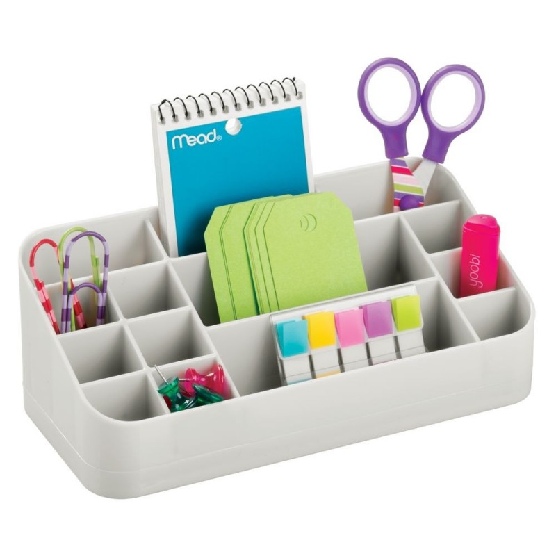 С помощью этого органайзера для косметики ваши помощники красоты прекрасно разместятся. В нем большое количество отделений разной ширины. Изготовлен из современного серого пластика, прост в использовании и в случае необходимости легко моется.