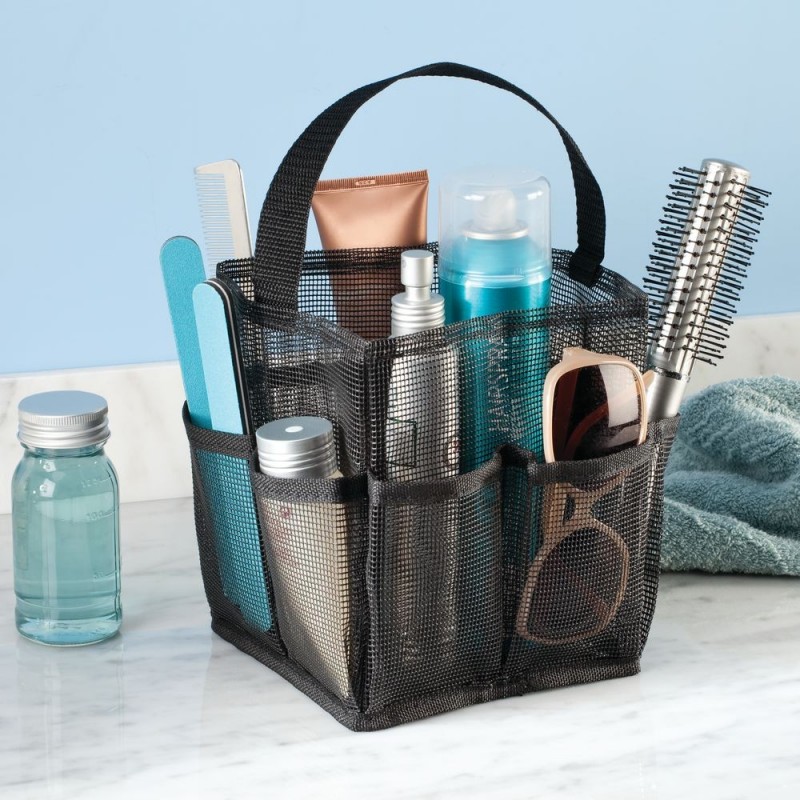 Обратите внимание на нашу корзину-сетку для более удобного хранения различных косметических средств. Она очень приятна в применении и достаточно вместима. Хранить гели, лосьоны, шампуни и прочие мелочи станет намного проще. Корзина изготовлена из прозрачной синтетической сетки и имеет четыре наружных кармана, поэтому найти свои вещи будет очень легко!