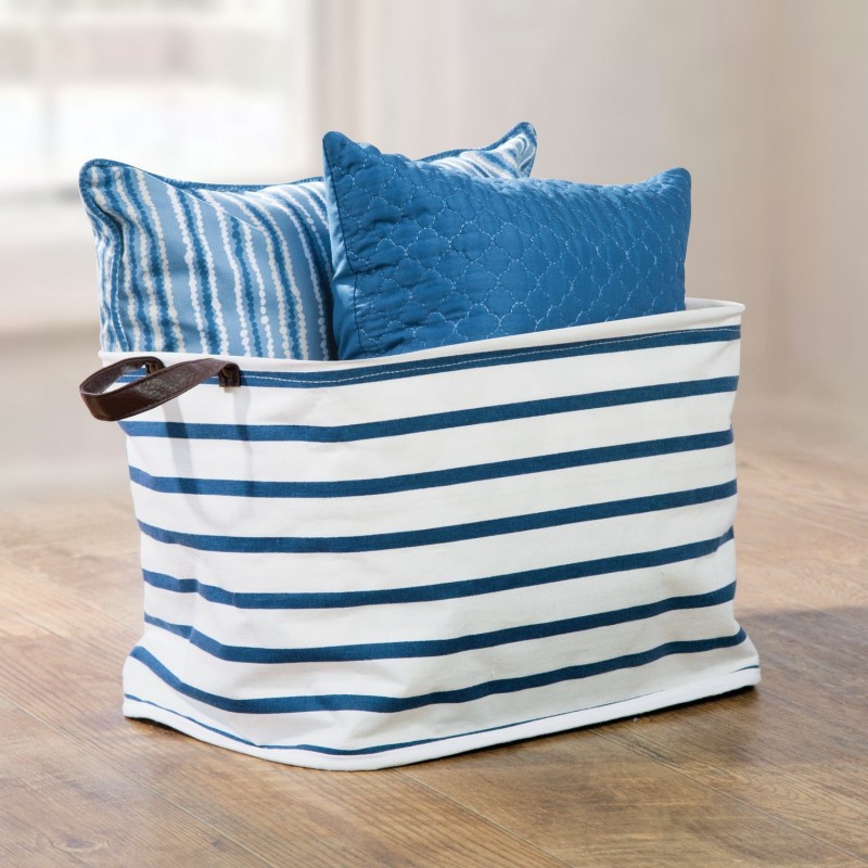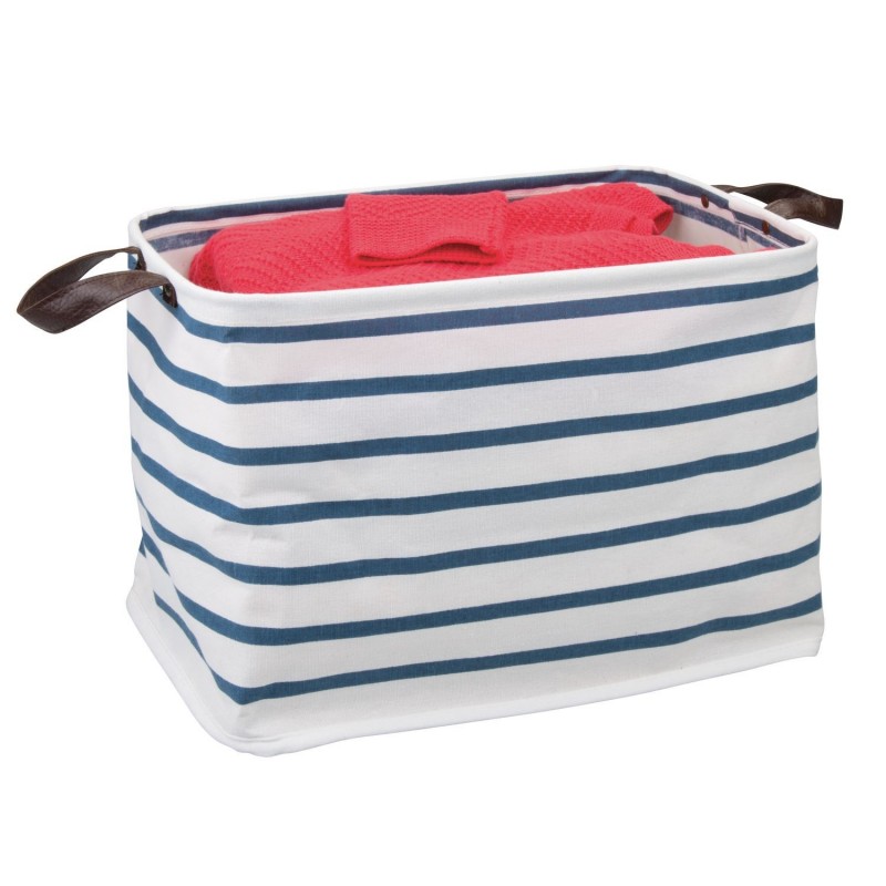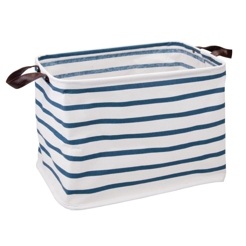 Складной хлопчатобумажный короб для хранения Riley со встроенными ручками и водостойким покрытием. Этот вместительный короб выполнен в привлекательном сине-белой полосатой расцветке, в котором есть две встроенные ручки из коричневой искусственной кожи. Обеспечит легкое хранение в ванной, гостиной, спальне, детской, игровой комнате или где нужна правильная организация пространства. Можно протирать влажной салфеткой от пыли.Отлично подходит для хранения ежедневных предметов первой необходимости, таких как банные полотенца, одеяла, игрушки, обувь, журналы, детские товары.