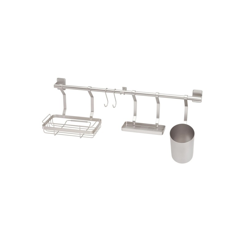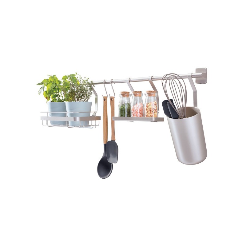 На штанге есть несколько крючков разных размеров, а также емкость, чтобы поместить туда приборы для готовки. На крючки можно вешать разделочные доски, кастрюли и сковороды, сотейники, лопатки и половники.