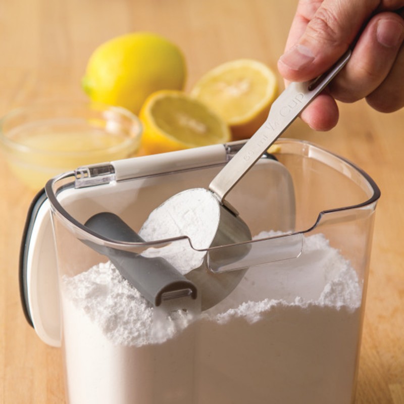 Контейнер для хранения сахарной пудры представляет собой высококачественную конструкцию с силиконовым уплотнением для герметичного хранения. Он включает в себя мерную ложку для пудры и съемную выравнивающую планку для удобного измерения, оба предмета удобно размещаются под крышкой для хранения. Контейнер для хранения объемом 1,3 литра имеет легко защелкивающуюся защелку, которая удерживает крышку плотно закрытой. Петли из нержавеющей стали, широко открываются, обеспечивая беспрепятственный доступ к наполнению или измерению. Можно мыть в ПММ.