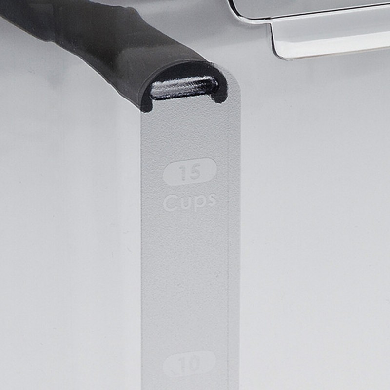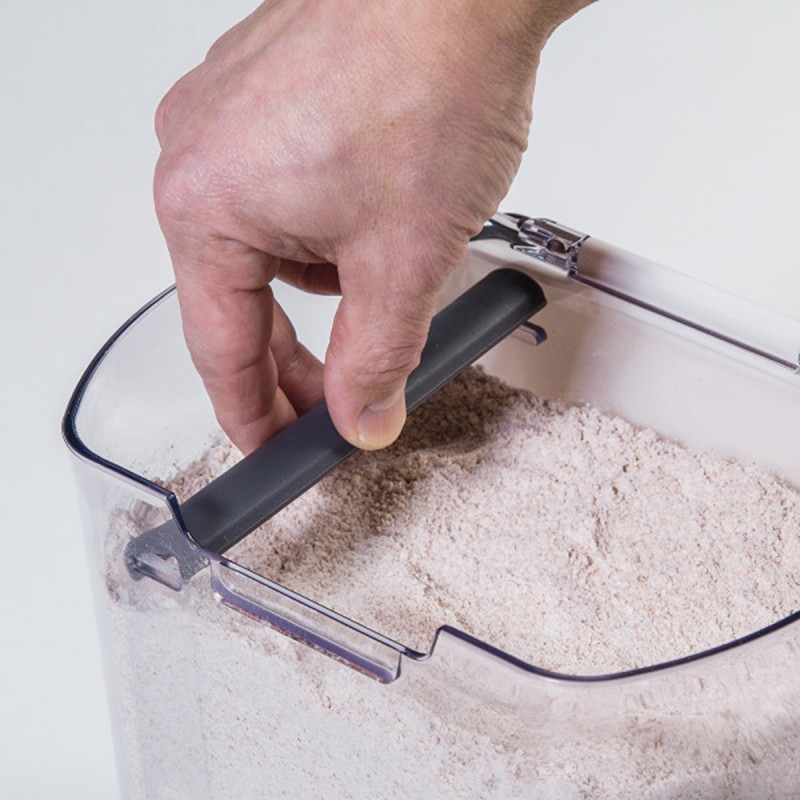 Контейнер для сыпучих продуктов имеет силиконовое уплотнение для герметичного хранения. Съемный ограничитель для удаления излишков защелкивается на внутренней стороне крышки для удобного хранения. Метки измерения ясно показывают оставшуюся муку. Емкость 3,7 л. Можно мыть в посудомоечной машине.