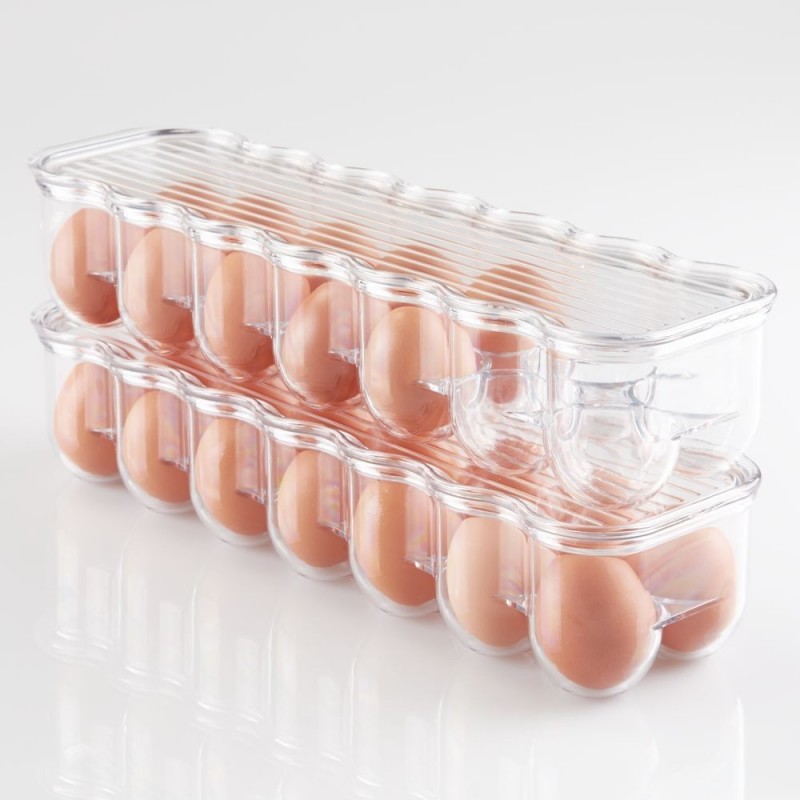 Контейнер для яиц iDesign Fridge Binz защищает яйца и хранит их в порядке! Этот уникальный предмет, сделанный из прочного пластика, вмещает до 14 яиц и имеет крышку и встроенную ручку для удобной транспортировки. Изготовлен из прочного прозрачного пластика без бисфенола А, поэтому вы всегда будете знать, сколько яиц осталось! Когда дело доходит до очистки, этот контейнер легко чистить просто вымойте его вручную с мягким моющим средством и водой! Контейнер имеет размеры 36,2х10,8х7,6см, что делает его идеальным для любого холодильника.
