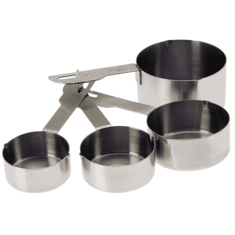 Наши мерные чашки в классическом стиле имеют контурные ручки, которые легко лежат в ваших руках во время использования. Каждая чашка имеет стандартные и метрические размеры, четко отображаемые вдоль каждой ручки. В набор входят: стакан 50 мл ⅓ стакана, 80 мл ½ стакана, 120 мл и 1 стакан 240 мл. Кольцо для хранения удерживает чашки вместе. Материал: нержавеющая сталь. Можно мыть в посудомоечной машине.