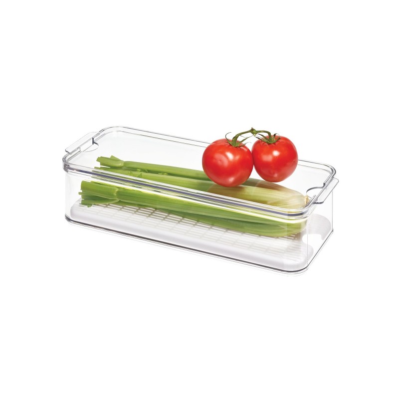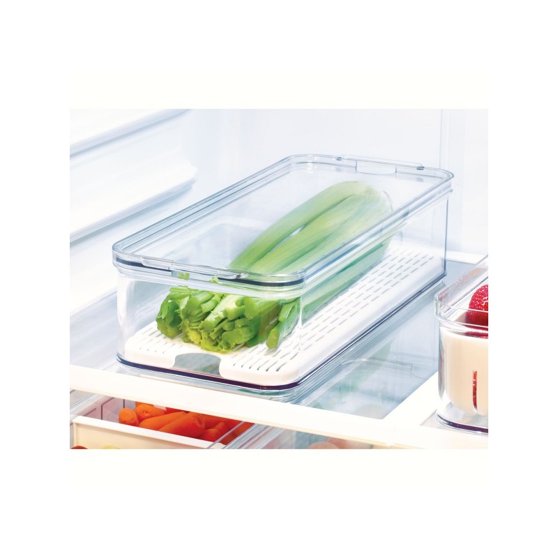 Идеальный помощник для хранения овощей, фруктов, ягод и зелени в вашем холодильнике, морозильной камере, кладовой или в шкафу. Этот удлиненный контейнер достаточно вместительный, а внутри имеет специальную дренажную решетку на дне.