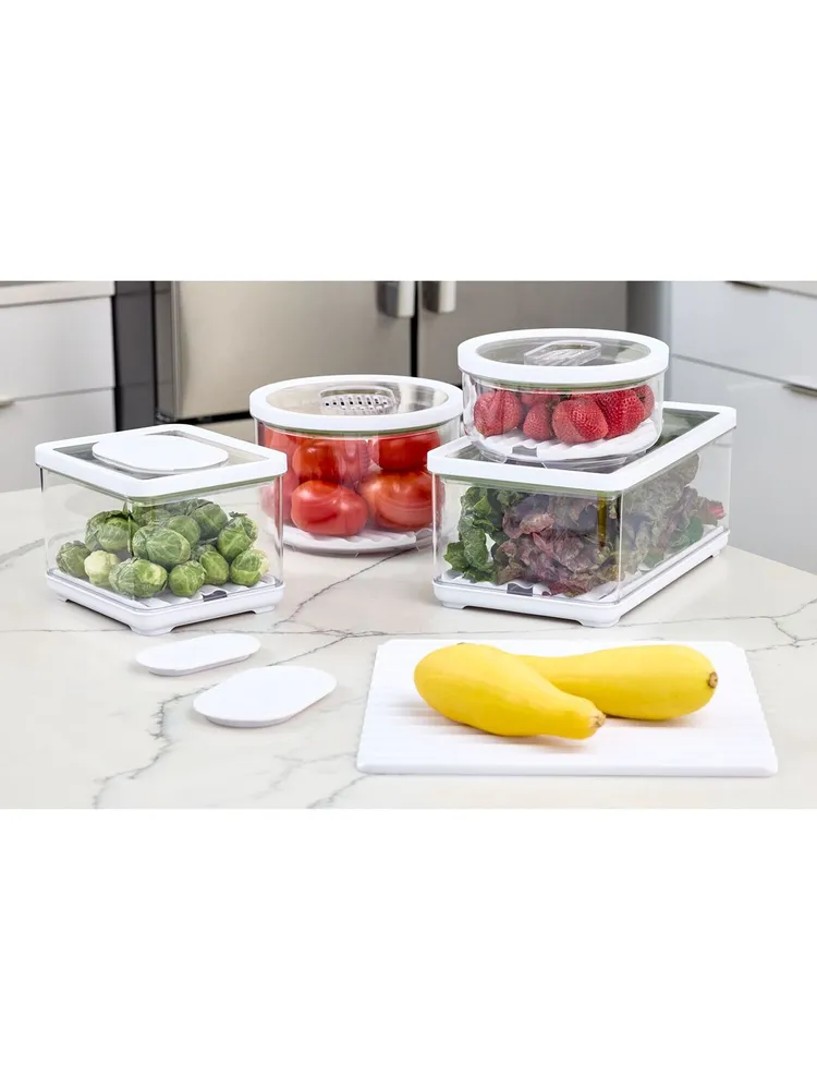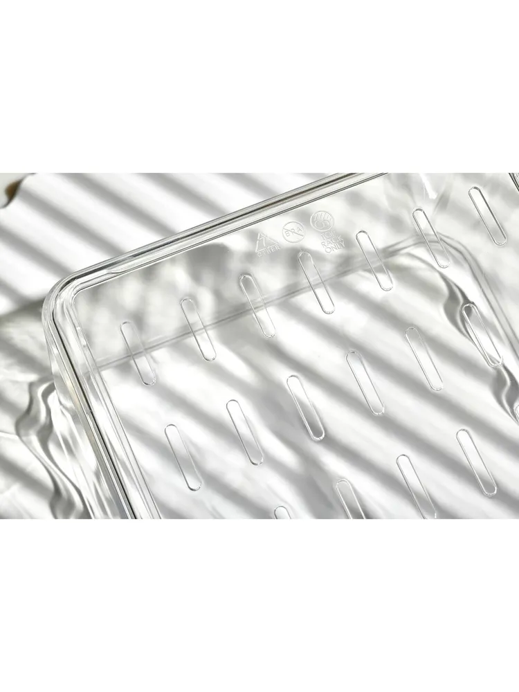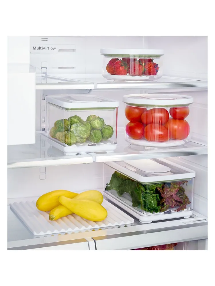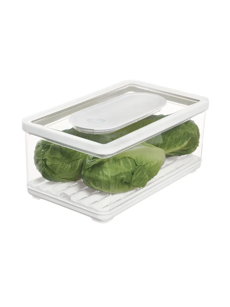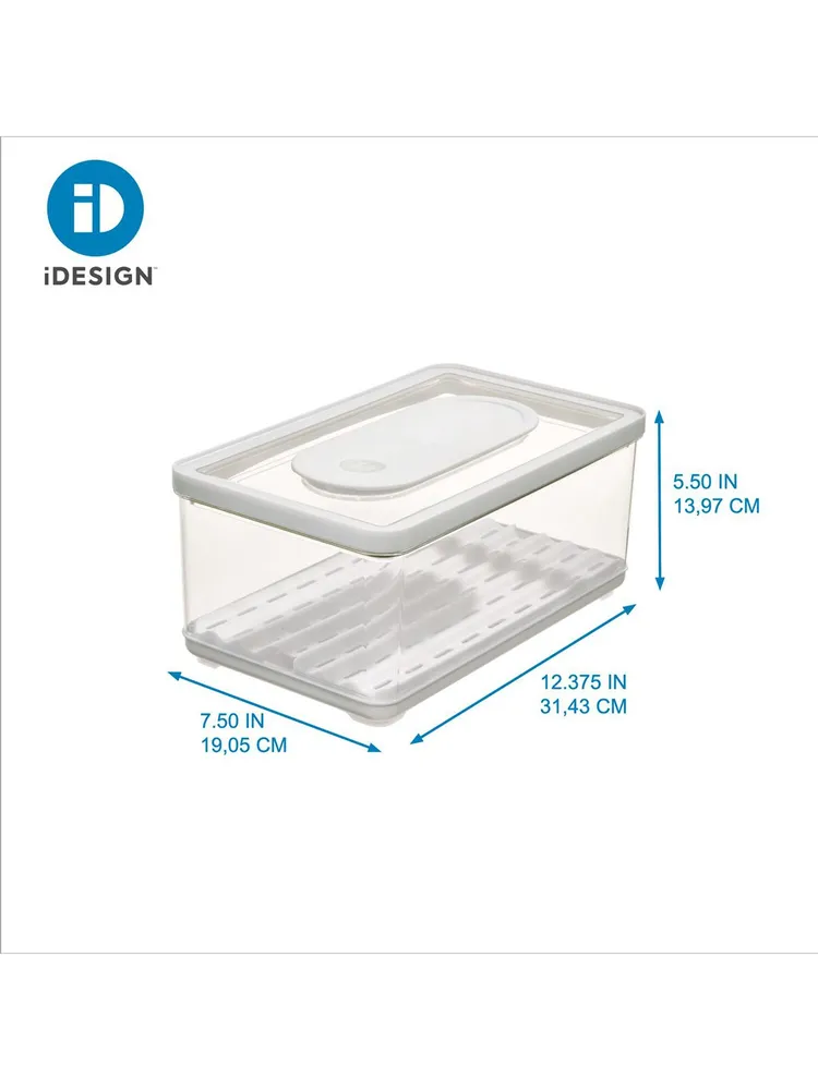 Этот экологически чистый контейнер iDesign IDFRESH предназначен для сохранения свежести продуктов и продления срока годности ваших любимых фруктов и овощей. Крышка со встроенным вентиляционным отверстием позволяет регулировать и контролировать влажность внутри контейнера, а нижнее отделение можно заполнить водой для обеспечения дополнительной влажности. Съемная ребристая вставка уменьшает возможность повреждений нежной поверхности фруктов и обеспечивает дополнительный поток воздуха, сохраняя продукты, хранящиеся внизу, такими же свежими, как и продукты сверху. Контейнер можно использовать как в холодильнике, так и на столе для фруктов и овощей, которым нужно время для созревания. Прозрачные стенки позволяют легко видеть предметы, хранящиеся внутри, и его можно штабелировать с дополнительными контейнерами из коллекции IDFRESH. Его можно мыть в посудомоечной машине для быстрой и легкой очистки. Этот многоразовый контейнер изготовлен из переработанного пластика, не содержащего бисфенол А, что обеспечивает более экологичный вариант хранения. Длина 31.4см, ширина 19см, высота 14см.