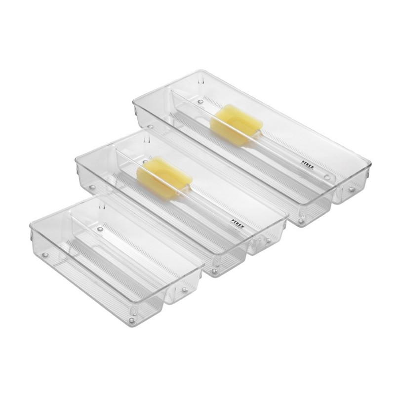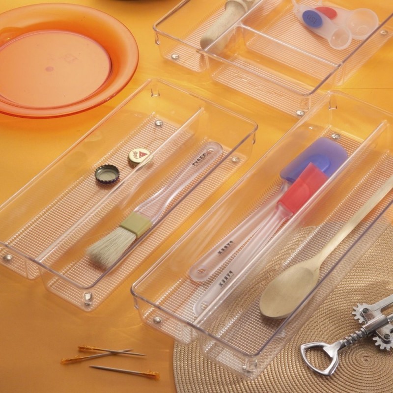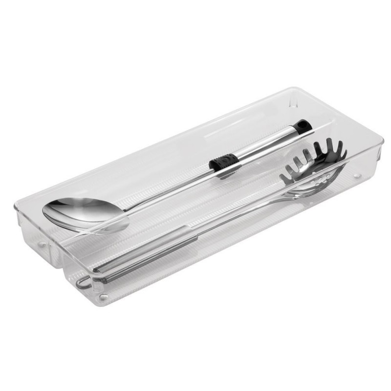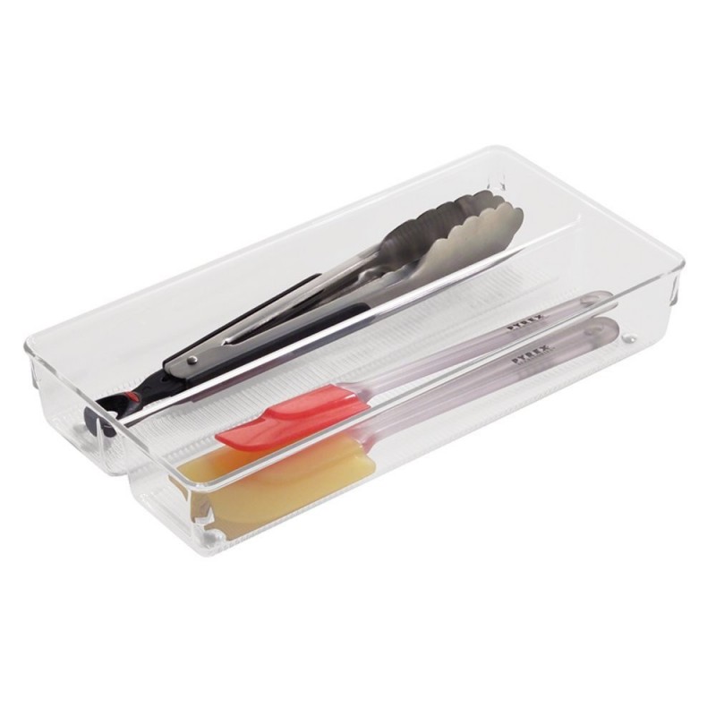 Максимально используйте пространство для хранения с помощью лотка-органайзера iDesign Linus. Этот низкопрофильный разделенный лоток имеет два отделения для хранения и размещения столовых приборов, посуды, шпателей и многого другого в ящиках кухни и кладовой. Благодаря прозрачным сторонам и открытому верху содержимое всегда видно и доступно, а нескользящие ножки удерживают органайзер на месте и предотвращают его соскальзывание при открытии и закрытии ящика. Его также можно штабелировать и сочетать с дополнительными органайзерами ящиков Linus (продаются отдельно), чтобы максимально увеличить пространство для хранения. Этот универсальный лоток для хранения также можно использовать в ванной, спальне, офисе или в любой комнате дома, где вам нужна дополнительная организация. Эта вставка в выдвижной ящик, изготовлена из прочного прозрачного пластика без бисфенола А, долговечна и ее легко чистить с помощью мягкого мыла и воды. Имея размеры 15.2х23x5.1см, она мгновенно создает организацию в компактных пространствах.