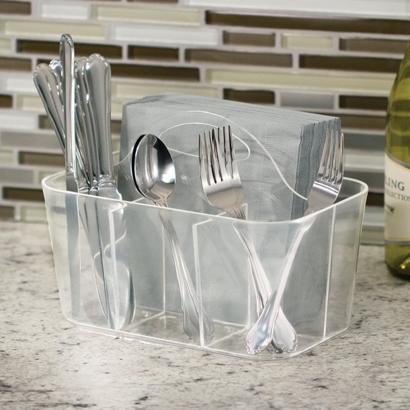 Портативный органайзер для хранения с 3 отсеками под столовые приборы и одним под салфетки - отличное дополнение к интерьеру любой кухни. Оснащен встроенной ручкой для удобной переноски, благодаря чему вы сможете с легкостью перемещать его. Отлично подходит для пикников и использование вне дома. Изготовлен из прочного пластика