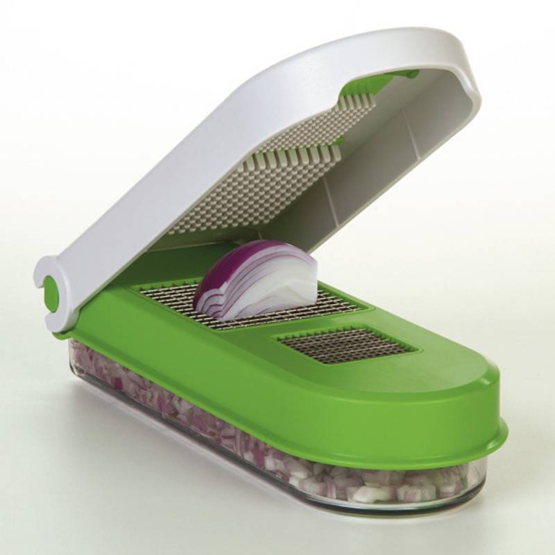 Быстро нарежьте лук, перец и чеснок кубиками без запаха, слез и беспорядка! Очистка проста благодаря встроенной решетке на крышке, которая удаляет излишки пищи, если ее вытащить. Можно мыть в посудомоечной машине.