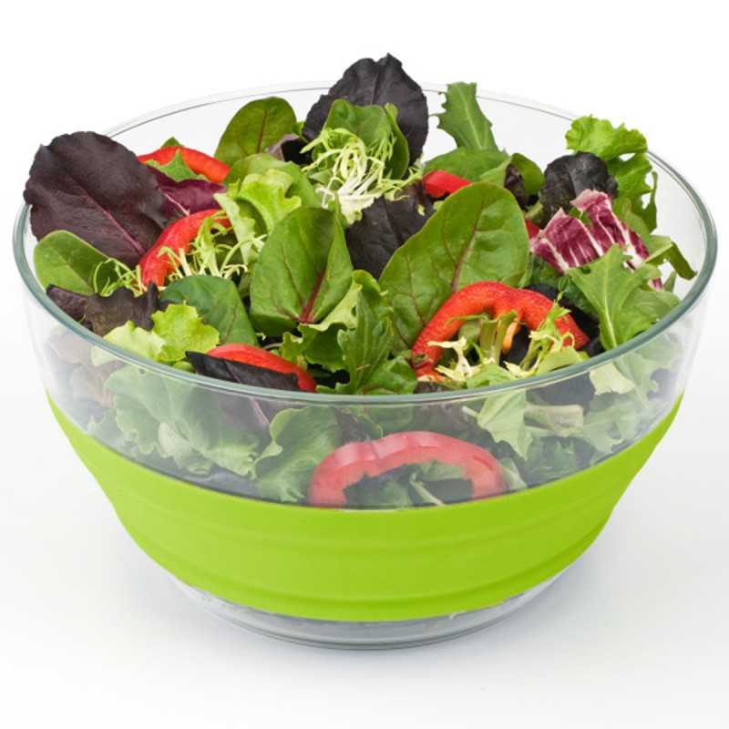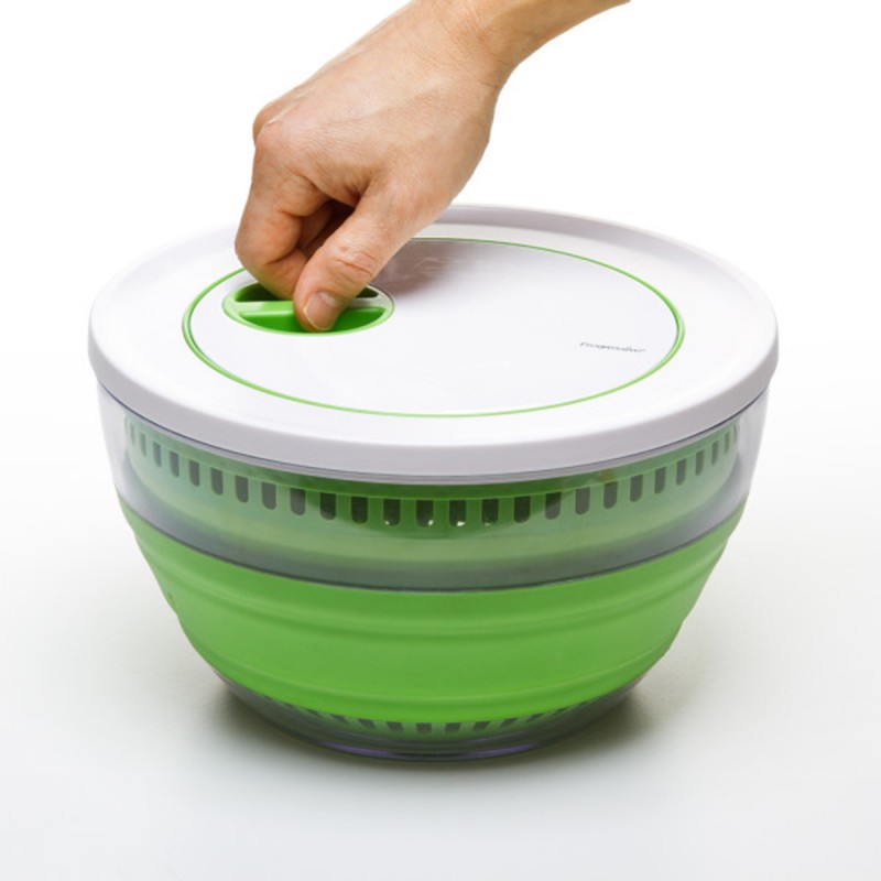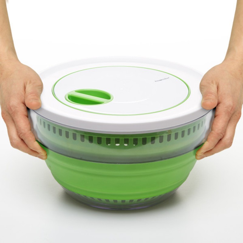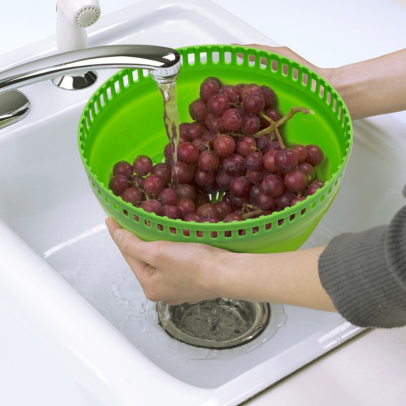 Наша складная вращающаяся корзина создана для мытья и сушки салата. Она складывается до половины своего размера для компактного хранения. Высокоэффективная вращающаяся корзина служит дуршлагом. Встроенная ручка вращает корзину. Сожмите боковины корзины для легкого торможения. Можно мыть в посудомоечной машине.