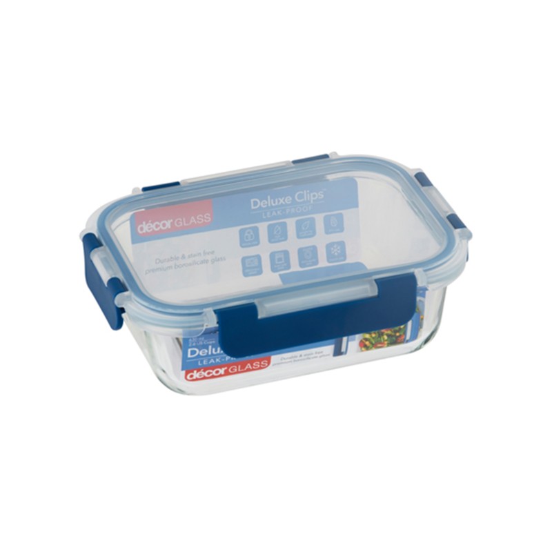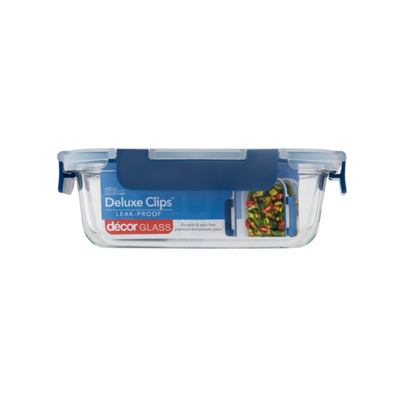 Контейнер премиум класса из боросиликатного стекла 630мл. Сохраняйте свежесть продуктов дольше с нашей новой линейкой контейнеров Deluxe Clips. Благодаря 4 фиксаторам, предотвращающим утечки, и крышкам с плоскими краями для удобного штабелирования, вы быстро обнаружите, что это идеальное решение для хранения продуктов от Decor. Изготовлено из боросиликатного стекла, не оставляющего пятен, имеет съемный силиконовый уплотнитель для легкой очистки. Подходит для холодильника, морозильной камеры, микроволновой печи, можно мыть в посудомоечной машине (только на верхней полке). Не содержит бисфенол А. Размер 183х137х62мм.