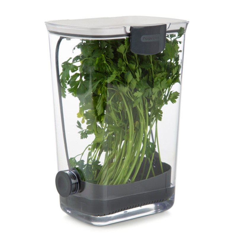 Идеальный контейнер для хранения зелени с силиконовым уплотнителем сохраняет зелень свежей в течение длительного периода времени. В нем хранится 1-3 пучка свежих трав, таких как петрушка, кинза, розмарин, спаржа. Узкий корпус прекрасно помещается в холодильнике или на кухонном столе. Травы остаются во внутренней корзине, которая поднимается и опускается при открытии и закрытии крышки. Это позволяет легко извлекать травы и автоматически сливать воду при поднятии корзины. Прилагаемая корзина снимается для легкой очистки. Съемная силиконовая заглушка позволяет сливать воду, не удаляя травы, что упрощает пополнение водой. Не содержит бисфенол А, можно мыть в посудомоечной машине.