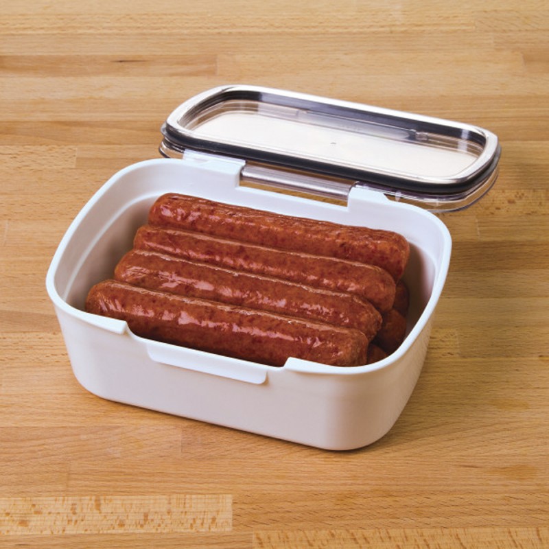 Контейнер объемом 0,63 л с силиконовым уплотнением на крышке дольше сохраняет свежесть мясных деликатесов и сыров. Прозрачная крышка позволяет видеть содержимое. Рифленое дно отделяет сок от мясных деликатесов. Откидная крышка откидывается, специальная секция на крышке для записи дат хранения маркером для сухого стирания. Можно мыть в посудомоечной машине.
