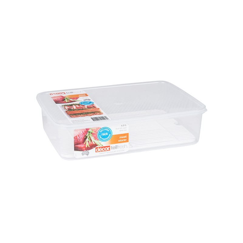 Контейнер Tellfresh 4л имеет съемную решетку, которая позволяет воздуху циркулировать вокруг продуктов, сохраняя их свежесть в течение длительного времени. Идеально подходит для транспортировки мяса, колбас или рыбы на барбекю или при хранении мяса в морозильной камере для последующего размораживания. Контейнер можно мыть в посудомоечной машине (только верхняя полка), можно использовать в микроволновой печи, в морозильной камере. Безопасно для пищевых продуктов, не содержит бисфенола А. Размер 315х241х78мм. Произведено в Австралии.