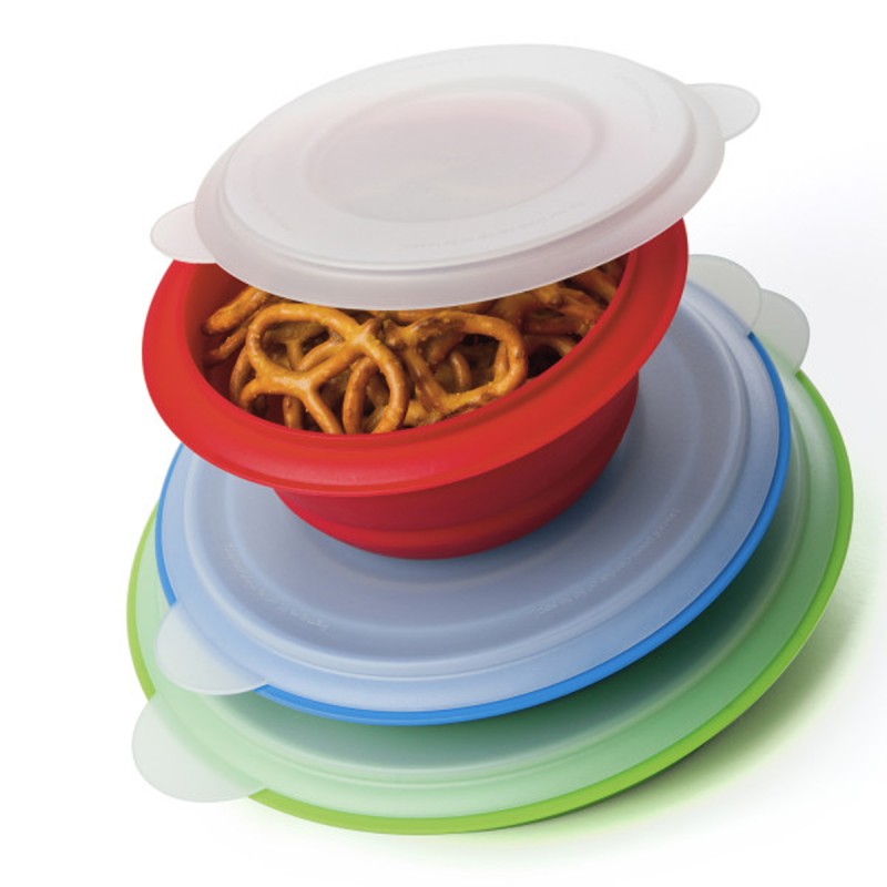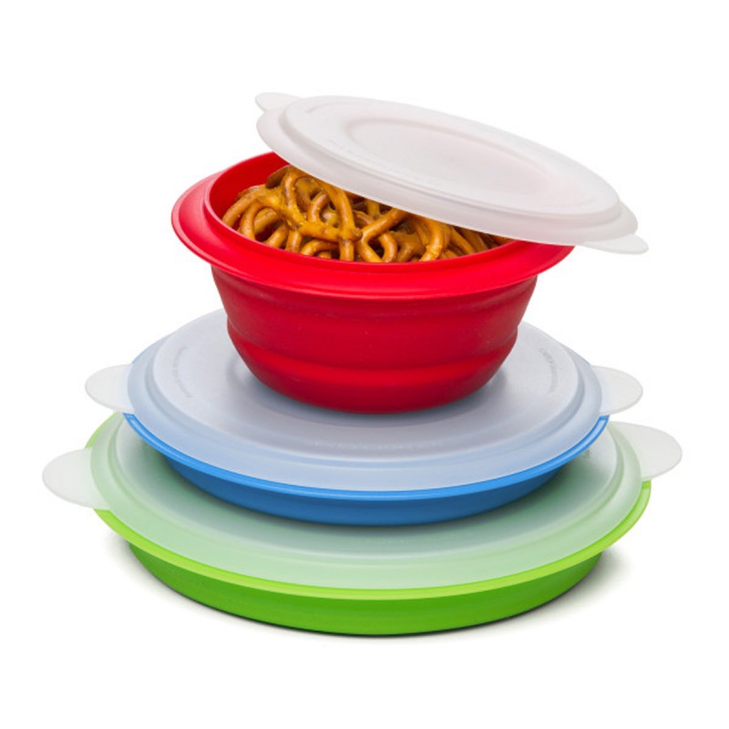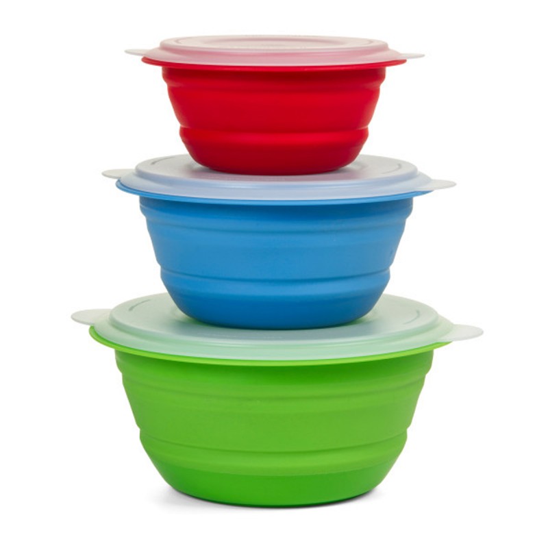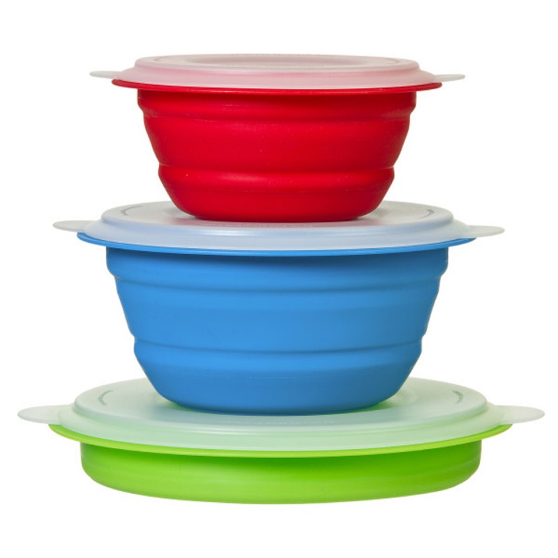 Этот универсальный набор складных мисок идеально подходит для приготовления, хранения и разогрева остатков еды. Три удобных размера 354мл, 710мл, 1,18л отлично подходят в качестве ланч-бокса для похода или кемпинга. Контейнеры оснащены защелкивающимися крышками. По окончании использования емкости складываются до ⅓ своей исходной высоты для удобного хранения в ящике или шкафу. Можно использовать в микроволновой печи и морозильной камере, мыть в посудомоечной машине.