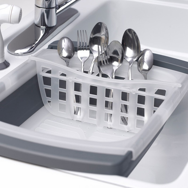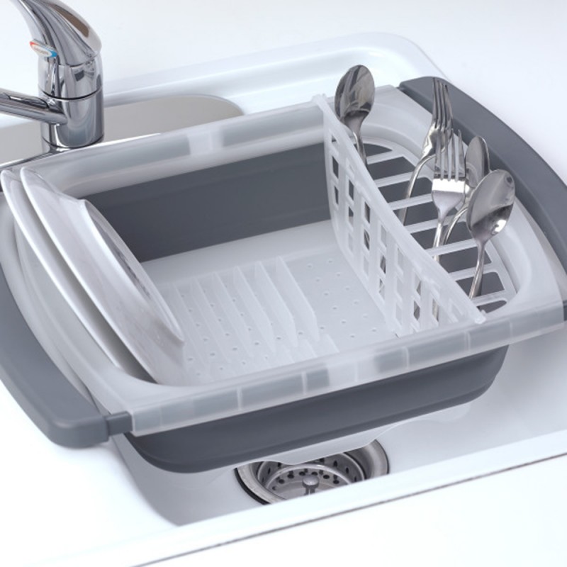 Наша складная сушилка для посуды над раковиной это идеальное решение для максимального увеличения рабочего пространства. Она оснащена выдвижными кронштейнами, которые подходят для большинства раковин. Жесткая конструкция позволяет сушке для посуды стоять самостоятельно, но при этом легко складыватся до ⅓ своего первоначального размера для хранения под раковиной. Вмещает 8 тарелок диаметром до 25,4 см. Кронштейны увеличиваются от 42 см до 68 см. Можно мыть в посудомоечной машине.