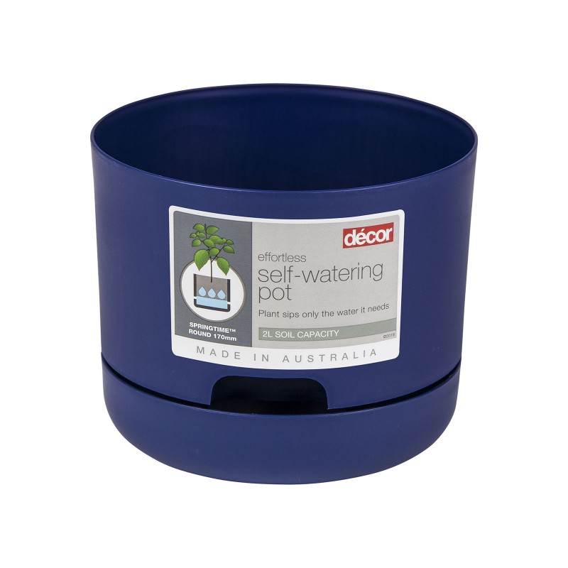 Горшок для цветов SPRINGTIME от DECOR оснащен встроенным резервуаром для воды, для снабжения растения влагой самостоятельно. Специальная конструкция способствует вентиляции корневой системы. Объем горшка 2 литра, размер 170х170х145мм, цвет синий. Произведено в Австралии.