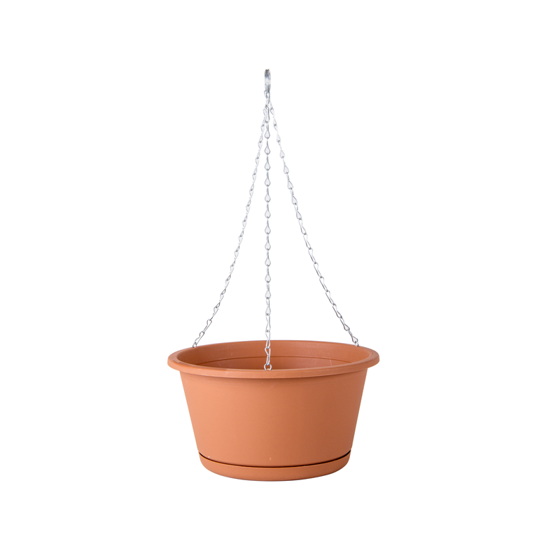 Горшок подвесной EVERGREEN 4,5 литра. Хорошо вентилируемое дно обеспечивает дренаж и аэрацию. Легко прикрепляемый поддон на клипсах. Цвет терракотовый. Размер 284х284х150мм. Длина изделия с цепью 50см. Произведено в Австралии.