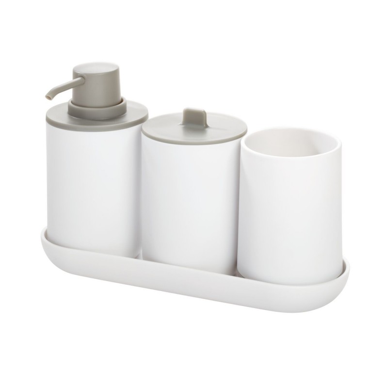 Этот набор предоставит все необходимое для ванной комнаты. В него входят 4 предмета: плоская подставка. в которую удобно помещаются дозатор для жидкого мыла. стакан-подставка для зубных щеток и емкость для хранения с крышкой. Дозатор для жидкого мыла имеет достаточно широкий насос. чтобы удобно распределять даже густые моющие средства или крем. Стакан-подставка для жидкого мыла оснащена внутри разделителем для хранения нескольких зубных щеток. в том числе и для более широкой электрической. А в закрывающейся емкости можно хранить ватные шарики. палочки. диски и многие другие мелочи. не боясь. что внутрь попадет вода или пыль. Набор из четырех аксессуаров выполнен из матового пластика. прочного и не царапающегося. Все емкости очень легко моются и чистятся и быстро сохнут.