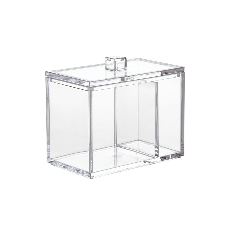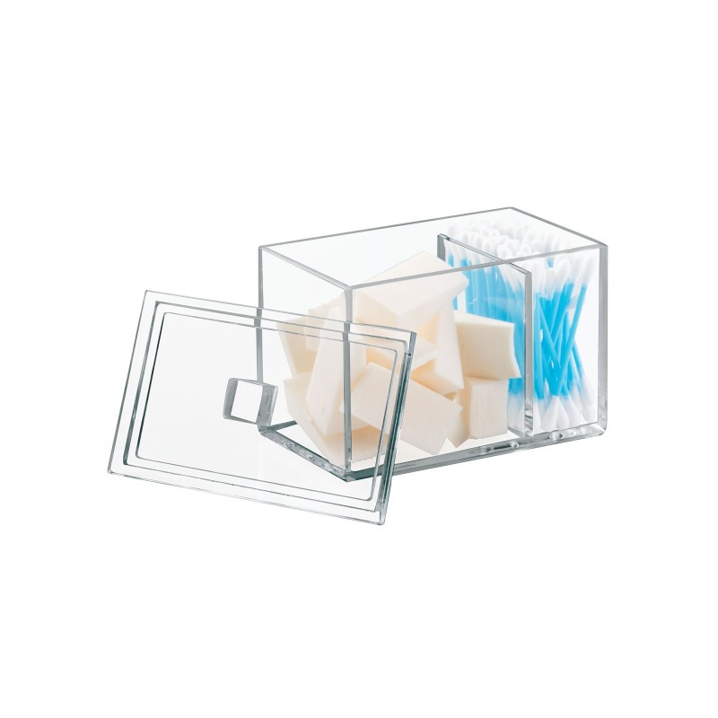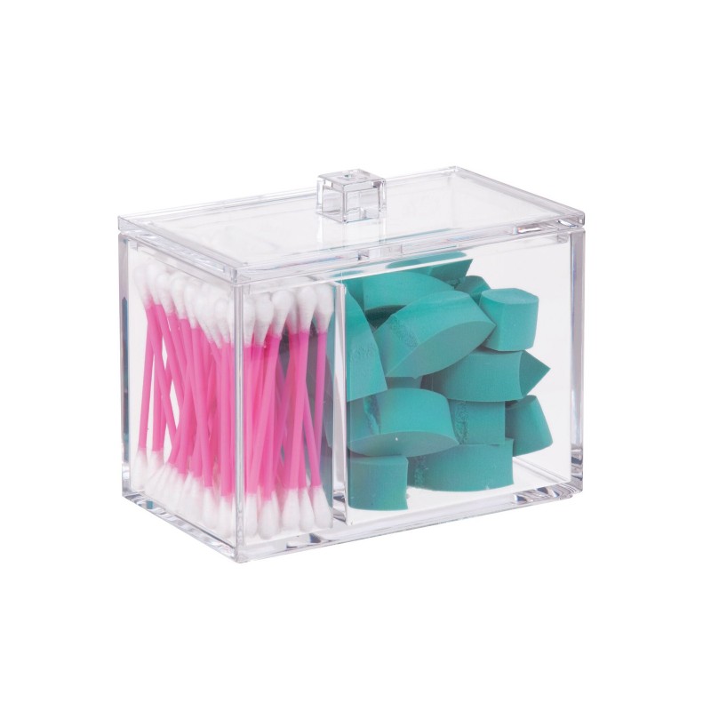 Органайзер состоит из двойной емкости с верхней крышкой. В одном отделении можно хранить ватные палочки, а в другой — ватные диски, к примеру. Также емкость подходит для хранения резинок, заколок и других аксессуаров для волос, украшений и бижутерии, прочих мелочей.