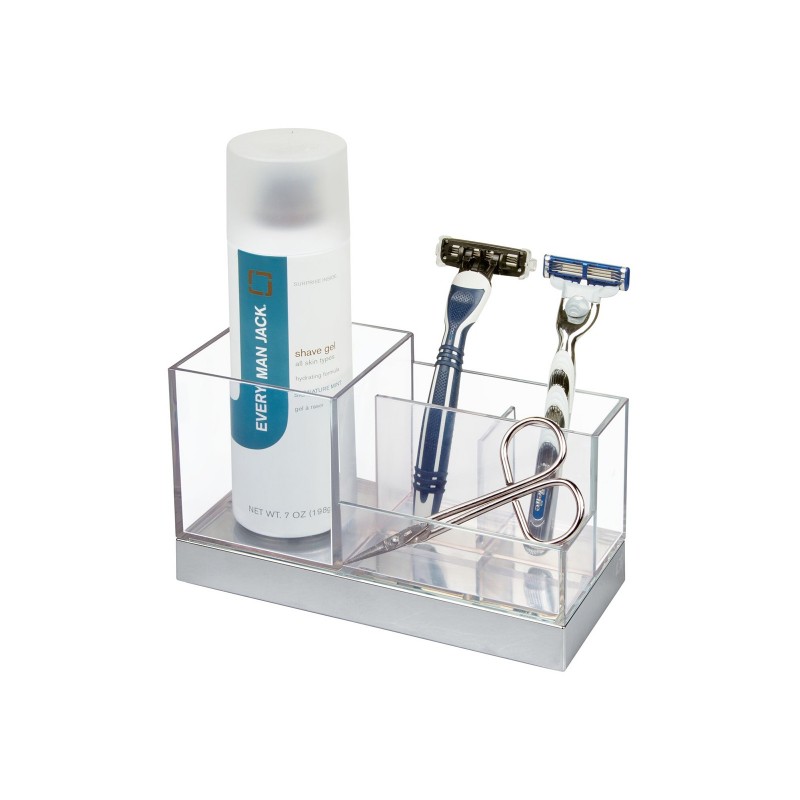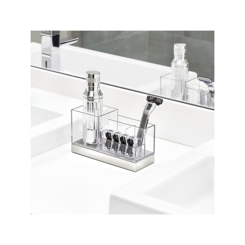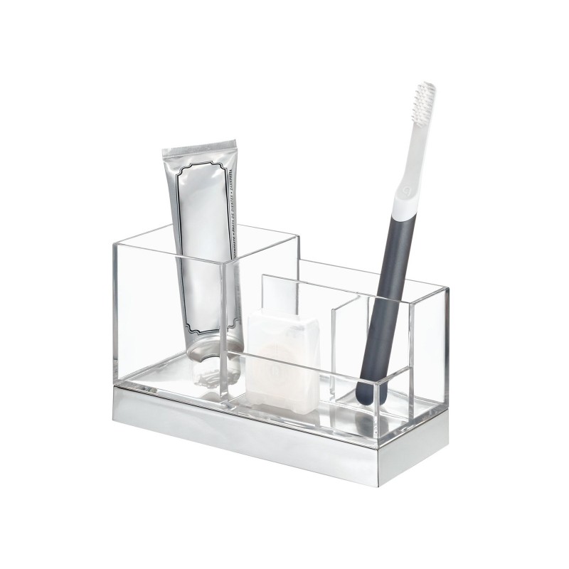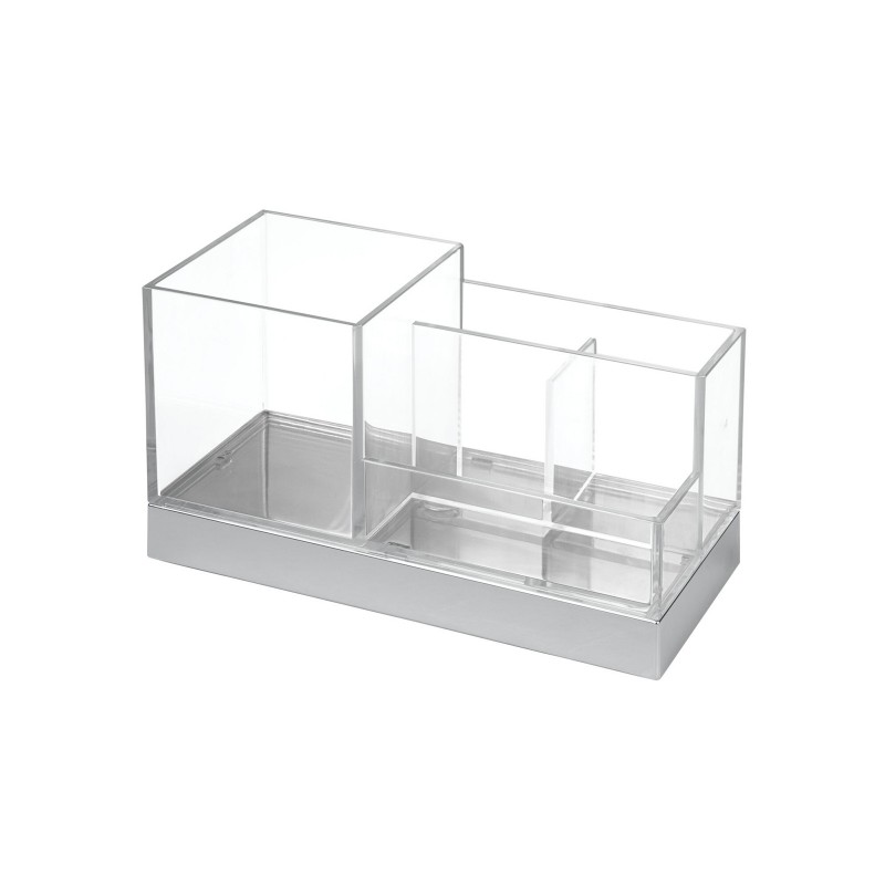 Стакан Clarity Square идеально подходит для любой комнаты в вашем доме. Поместите свою косметику, офисные принадлежности, ювелирные изделия и многое другое для легкого доступа. Он выполнен из прочного прозрачного пластика и имеет хромированную основу, которая является идеальным дополнением к любому интерьеру. Стакан разделен на 5 секций: два высоких отделения идеально подходят для хранения таких предметов как кисти для макияжа, зубные щетки. Передние секции для небольших предметов, такие как кольца, серьги, контактные линзы и многое другое. Размер 18,5х8х10,7см.