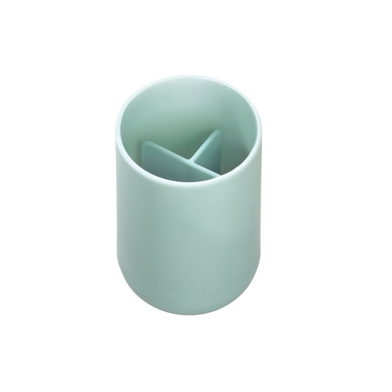 Держатель для зубных щеток имеет форму цилиндрического стакана, разделенного внутри на три отсека. Внутренний разделитель держателя зубных щеток легко вынимается, что позволяет вымыть и высушить как основную емкость, так и этот разделитель при необходимости.