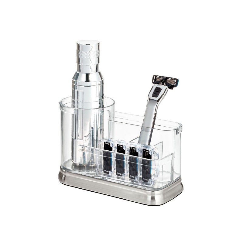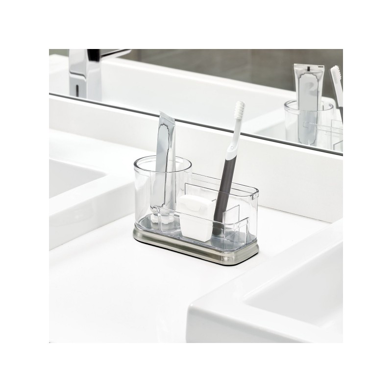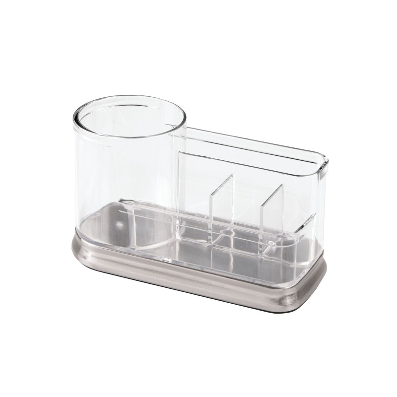 Gina Vanity Centre - стакан для хранения косметики, стоматологических принадлежностей, принадлежностей для волос, ватных палочек, предметов макияжа, канцелярских товаров, товаров для рукоделия, бижутерии. Выполнен из прочного прозрачного пластика и имеет основу из нержавеющей стали, которая является идеальным дополнением к любому интерьеру. Стакан разделен на 5 секций для хранения различных предметов. Два высоких отделения идеально подходят для хранения более высоких предметов, таких как кисти для макияжа, зубные щетки. Передние секции могут содержать небольшие предметы, такие как кольца, серьги, контактные линзы и многое другое. Размер 18,3х8х10,7см.