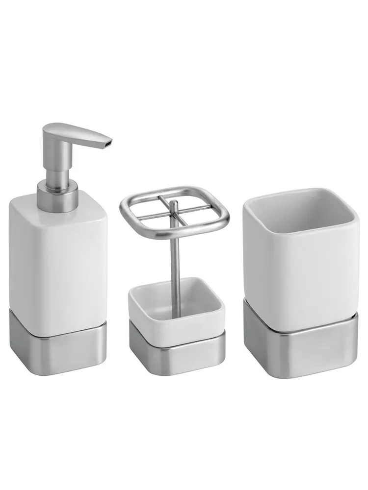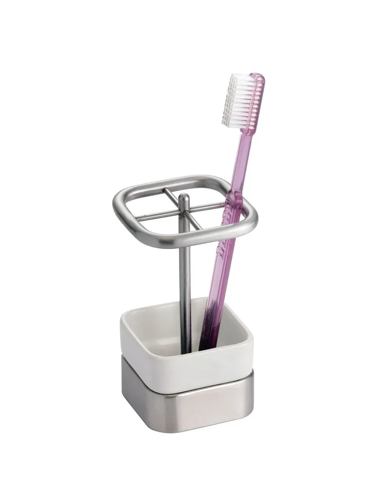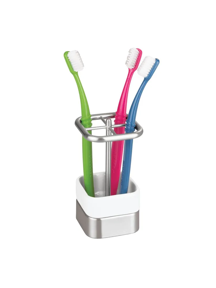 Организуйте свой туалетный столик стильно с подставкой для зубных щеток iDesign Gia. Этот органайзер для зубных щеток состоит из четырех разделенных секций, чтобы хранить несколько зубных щеток в вертикальном положении и в пределах досягаемости от раковины. Открытая конструкция позволяет влажным зубным щеткам более эффективно высыхать после использования, а также обеспечивает легкий доступ к ним. Этот универсальный настольный органайзер можно использовать для хранения кистей для макияжа, косметики, бритв и многого другого. Его также можно комбинировать с другими предметами коллекции Gia, чтобы легко скоординировать и организовать ванную комнату. Современный дизайн с серебряной и белой отделкой сочетается с различными стилями декора, а прочная конструкция из стали и керамики выдерживает ежедневное использование и легко чистится.