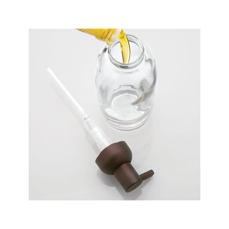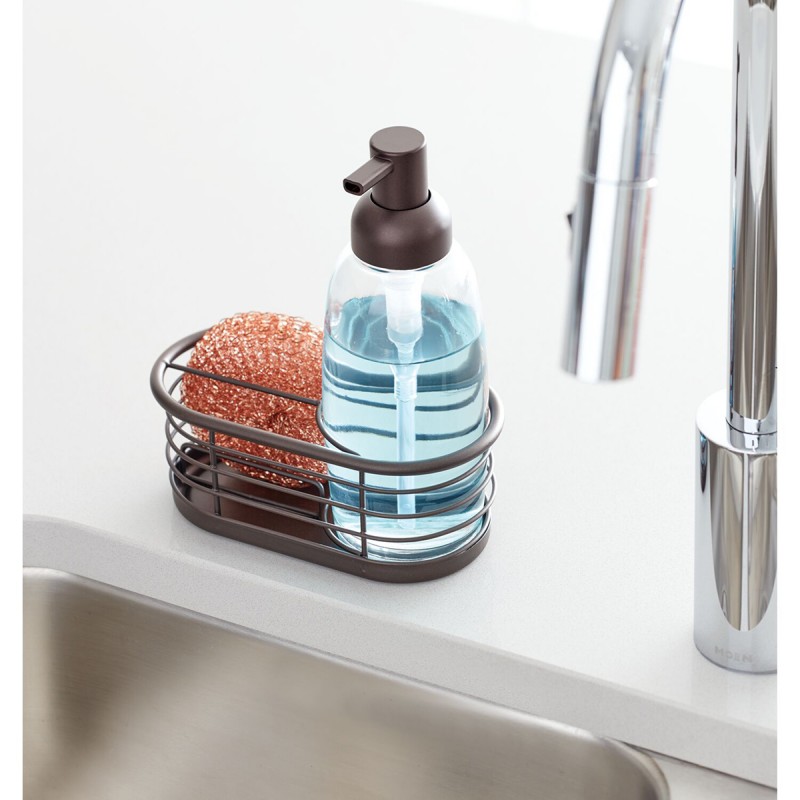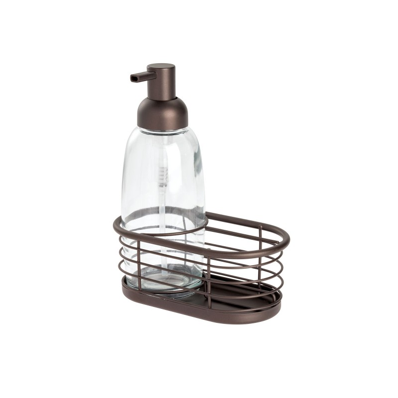 Дозатор Forma для жидкого мыла с 2 отделениями для хранения кускового мыла, губок, скрабберов имеет классический дизайн и изготовлен из прочной стали с бронзовой отделкой, которая подойдет к любому интерьеру. Дозатор для мыла имеет широкое отверстие, что позволяет легко наполнить его любимым жидким мылом для рук или лосьоном. В дополнительном отделении также можно хранить кисти для макияжа, подводки для глаз, туши для ресниц. Идеально подходит для столешниц в ванных комнатах, кухонных стоек, туалетного столика или офиса. В комплект входит пластиковый скраббер. Дозатор выполнен из стекла. Объем дозатора 350мл. Размер корзины с дозатором 16.5х9.1х20см.