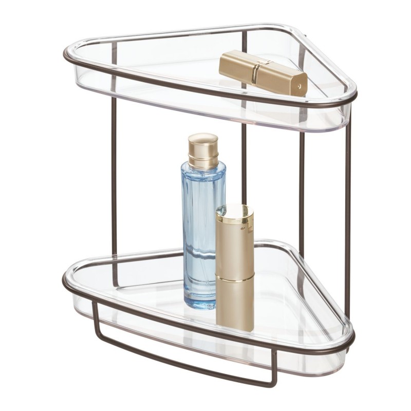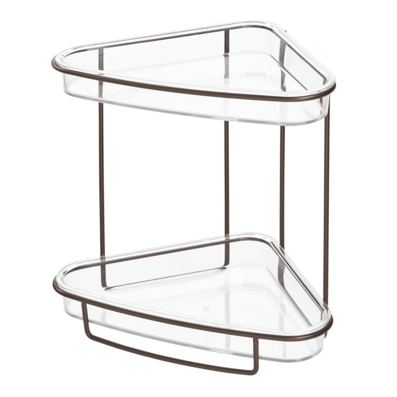 Двухуровневая угловая полка Clarity для хранения принадлежностей в ванной комнате, на столешнице, на письменном столе или туалетном столике. Полки идеально подходят для хранения лосьона, мыла, косметики, принадлежностей для волос и многого другого. Съемные пластиковые полки легко мыть при необходимости. Стальные опорные ножки полочной системы устойчивы к ржавчине и имеют матовую бронзовую поверхность, подходящую к любому декору. Длина лотка 24см, ширина 16,5см, глубина лотка 2см, высота полки 23см, расстояние от основания нижнего лотка до верхнего 20см.